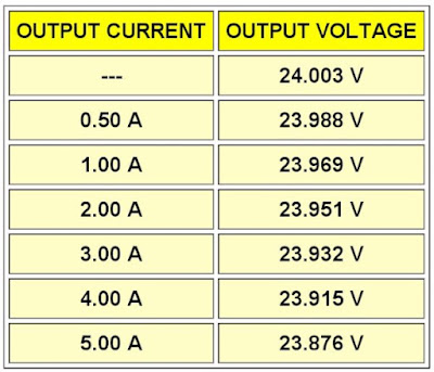 The output stability specifies the constancy of the output voltage as a function of the output current. From the drop in output voltage, you can calculate the internal resistance of the converter using Ohm's law. Since the maximum power is specified as 100 W without additional cooling, the output current is limited to 5 A. The results are summarized in the table below. Over a load range of 0 A to 5.00 A, the output voltage drops by 127 mV. This corresponds to an internal resistance of 25.4 mΩ.